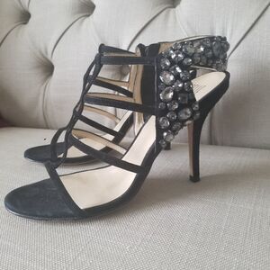 New PELLE MODA | suede heels black shoes t- straps crystals sz 10M