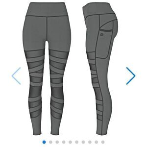 Brand new, too small for me and I stupidly never sent them back to get a bigger size, I just packed them into a tote of things I hoped I would slim down into lol. Heathered grey stretchy leggings with soft black mesh insert panels across the front giving a bandage effect, then solid in the back. 2 side pockets that can fit cellphones, etc.