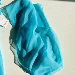 Chic satin prom gown with a long elegant skirt with a back slit, belt, and scarf