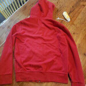 Cozy red hoodie with a zipper and hand pockets. Features a drawstring hood and embroidered logo.