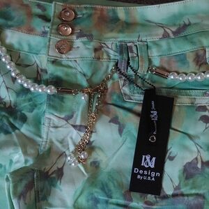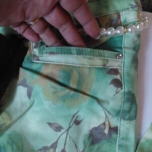 A snazzy pair of lime green floral skinny jeans. 3 button and zip front. 2 pockets front and faux pockets on back. Comes with pretty faux pearl belt that really dresses up the jeans. Size 13. Premium I&M Jeans USA.