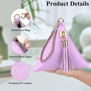 Triangle shape wristlet bag with detachable wrist strap and tassel charm which will never out of date. Simple but always fashion.