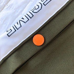 Atelier New Regime warm up pants track pants in an olive green colourway. Features jacquard logo tape down the legs with contrasting orange snap buttons, pin tuck detail at centre front and back, adjustable drawstring at waist, side pockets at front, and welt pockets with zip closure at back. Slim fit style.