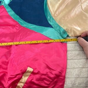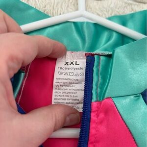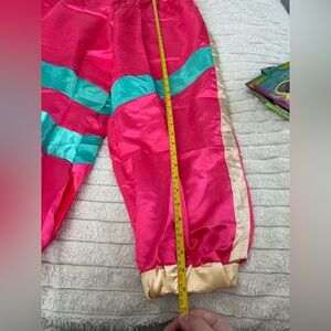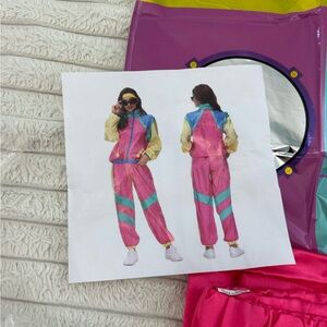 Vibrant retro outfit set with jacket, pants, and accessories. Features pink, blue, and cream colors.