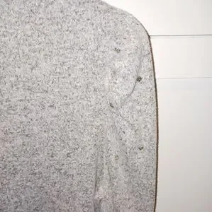 It's a light heather grey, cute puff sleeves with rhinestone detail that shimmer in the light. Material is INCREDIBLY soft and light, also has a lot of stretch too. Really nice length, not too short in the body - fits exactly like covershot.