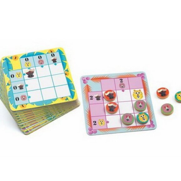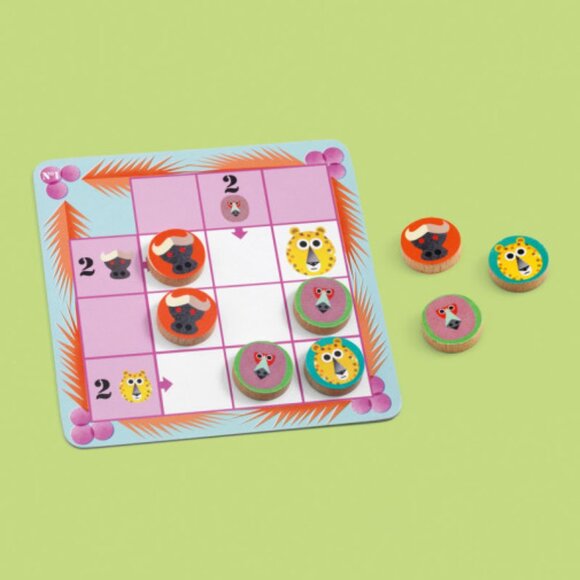 A logic and tactics game based on the principle of Sudoku for children aged 7 and over. Complete your grids with the initial constraints imposed. Will you be able to replace the 9 wooden pieces without making a mistake?
