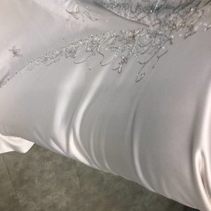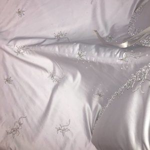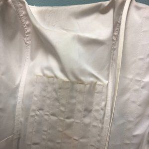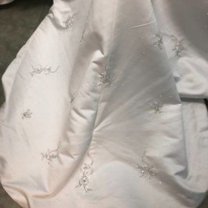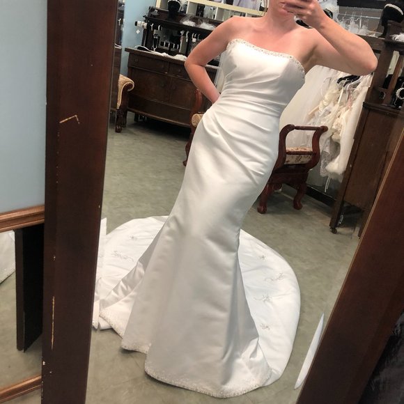This Zurg Impression bridal gown is brand new with tags, and never been altered or worn. It is a shop sample, that has been tried on A LOT. There are a few indications of it's having been tried; there is some very light soiling along the top of the inside of the bodice of the gown, pics are attached but it is very faint, and will come out very easily with a light cleaning. Priced accordingly.