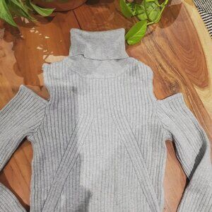 Soft super flexible non itch ribbed knit cold shoulder slim fit sweater.