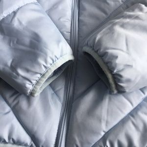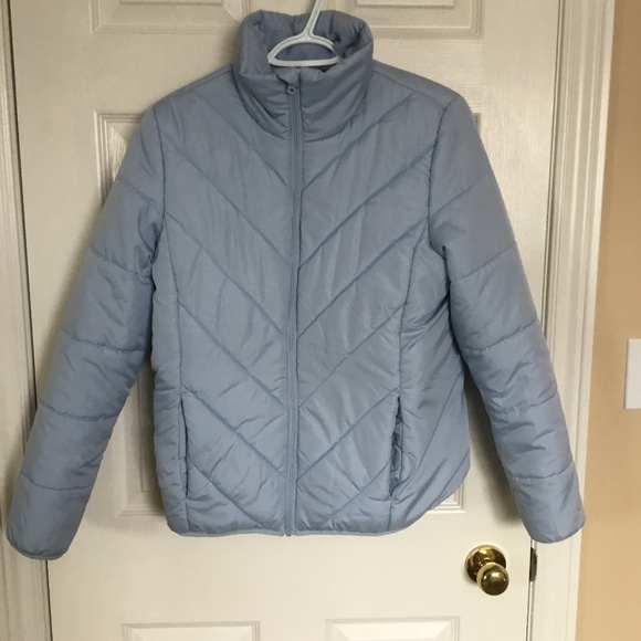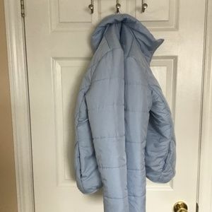 New, unworn powder blue warm ski jacket. Two front pockets, fleece neck.