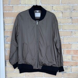 NWOT. Dark olive green. Beautiful lining and zipper side slits. Pockets in front and on one sleeve. Pictures 5,6 and 8 are truest colour. Oversized.