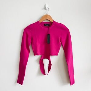 This is a crew-neck longsleeve with a strip cut-out detail and fully fashioned construction. It's knit with stretchy all-season yarn with a dry, cottony feel. This version is constructed using a Half Milano stitch for structure and a flat, dense feel.