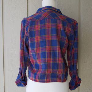 TOPSHOP Women's Shirt - casual - button and waist tie front - 3/4 rolled cuff sleeve. Plaid pattern - blue, red, yellow, orange.
