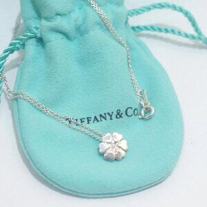 This is a sterling silver flower pendant with a small diamond in the center. This beautiful piece was designed by Paloma Picasso for Tiffany & Co. It comes on a 16 inch Tiffany chain and is like new!!
