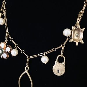 From the Heirloom Charm Collection. The Charm Short Necklace features several symbols of luck and longevity, including a jeweled clover, a wishbone, a whistle, a lock and a turtle, amid Swarovski-crystal pearl