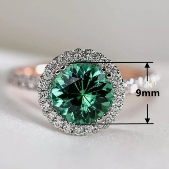 New Two Tone S925 Simulated Green Round Emerald Halo Ring