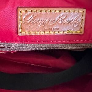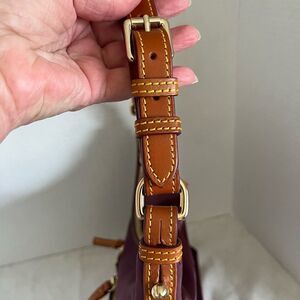 Dooney & Bourke Seville Plum Nylon Hobo Purse Dooney & Bourke Seville Hobo Purse (Handbag) Plum Nylon and Tan Leather with red Nylon Interior Measurements: 12"L x 8.5"W x 3.5"D Inside zip pocket. Two inside pockets. Two outside zip pockets. Cell phone pocket. Inside key hook. Zipper closure. Strap has 7 inch drop adjustable length.
