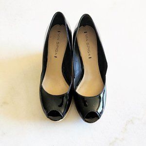 NWOT Via Spiga V-Stam black patent leather & cork open toe wedge shoe
