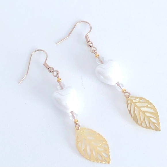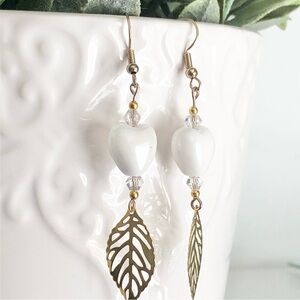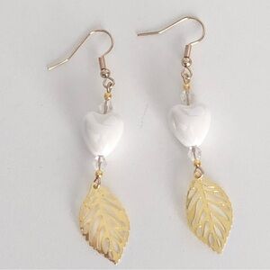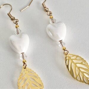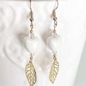 These unique, artisan, handcrafted, ceramic heart beaded with golden filagree leaf earrings were made by me.