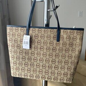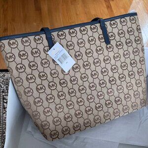 Michael Kors Montauk Tote. Condition: Perfect, Brand new with tag, never used. Size: Large. Color: BG/EB/NAVY. Exterior Material: MK Jacquard. Zipped top and outside zipper. Also has inside zipper with 4 slip pockets inside.