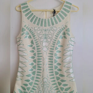 New With Tag Molly Bracken Shift Dress is a stunning and eye-catching piece that combines elegance with a touch of glamour. Size S. The dress features a beautiful cream and green color palette, creating a fresh and vibrant look.
