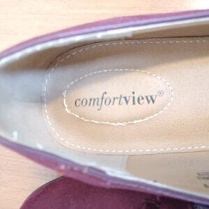 New, never worn burgundy suede slip on loafer. Size is 11 wide womens. Comfortview shoes have a padded insole so you can wear them all day in comfort. I have included photos of the inside of the shoes and the bottom of the shoes. There is some dust on the bottom from sitting on a shelf, but as you can see inside the shoes have never been worn. No box or tags.