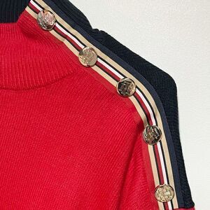 What a statementt this gorgeous red and navy silver Logo button sweater makes.