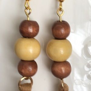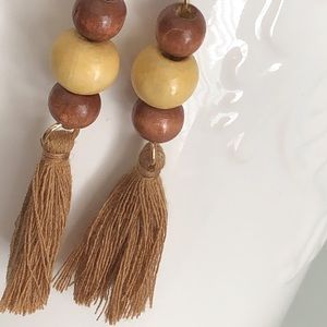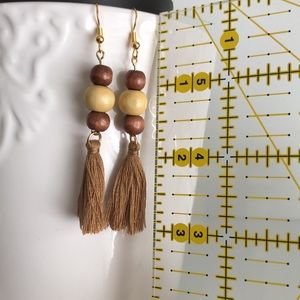 These natural wooded beads and fringe earrings are a great, neutral, casual way to accessorize any outfit.