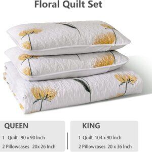 New Yellow Floral 3-Piece 100% Polyester Quilt Set • Reversible • KING Size