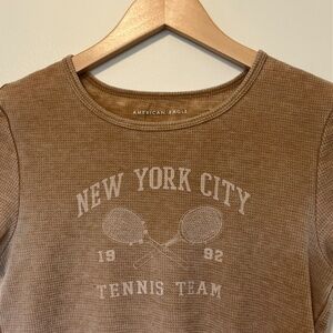 Cute lettuce hem tee with tennis graphic design print, made to look slightly faded