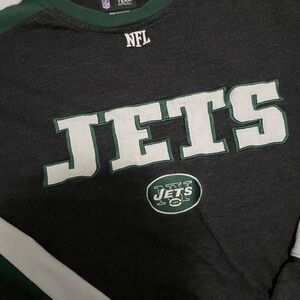Experience the comfort and style of the New York Jets Long Sleeve Pull Over, perfect for any casual occasion. Crafted from a soft cotton blend, this black sweater features a classic crew neck design and is machine washable for easy care. The regular fit ensures a comfortable experience, while the long sleeves make it an ideal choice for fall, spring, and winter seasons.The pullover is accented with the iconic NFL logo, adding a touch of sports heritage. Its solid color and subtle graphic print complement a variety of outfits, making it a versatile addition to any wardrobe. Whether you're out for a walk or cheering on your favorite team, this sweater keeps you looking sharp and feeling warm.