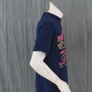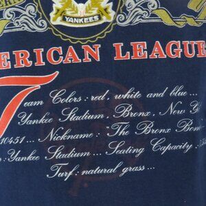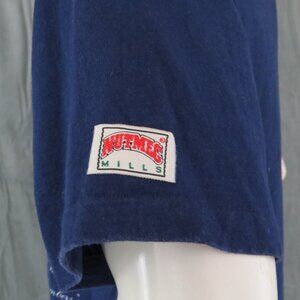 Up for sale is a stunning New York Yankees shirt by Nutmeg Mills. The shirt features a blue base colour. The shirt features heavy script graphics which describes the team's colours, stadium and other facts. The crowning piece of this shirt is a unique New York Yankees patch which is stitched into the shirt. The shirt features all the original Nutmeg tags as well. What a must have retro shirt.