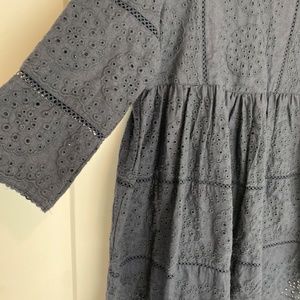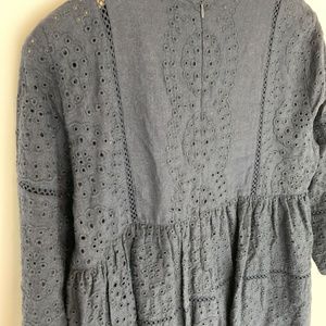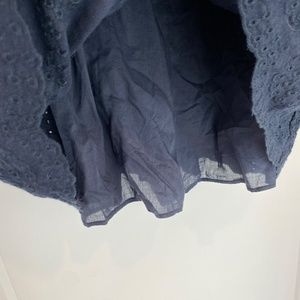 Eyelit detail, zip back, lined shorts underneath with 3/4 inch sleeves. The material is not stretchy, and I would say fits more like a Medium then large. Hits shorter on the thigh. Dark navy
