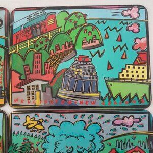 Set of 4 vintage hardboard placemats each with a different New Zealand city. Designed by Christine Harrison. Placemats have a cork backing.