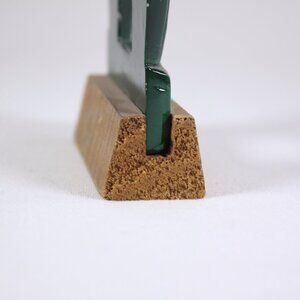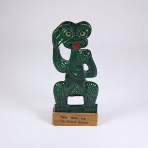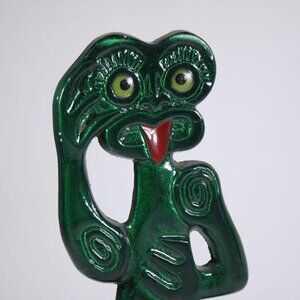 A fantastic bright glossy green bottle opener, shaped like a tiki totem of New Zealand. Comes with a wooden stand, marked to the front "This side up to open bottle" and "souvenir of New Zealand" underneath. With a slight bit of damage to the *ahem* opening area. 19.5 cm tall