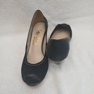 A beautiful and comfortable sturdy low heel design( 2" heels) from Ulas Fine Shoes. Soft black suede leather paired with a black patent leather on the heel portion of this practical shoe. Open toe. Padded foot bed and manmade sole. Handmade in Europe just for you! Many sizes to chose from.