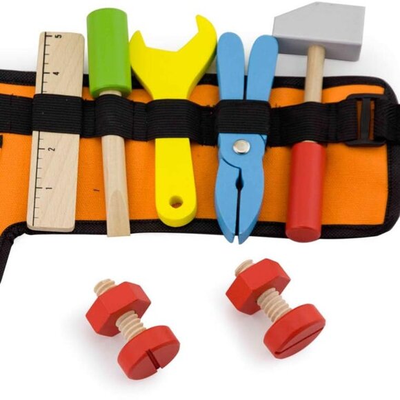 Includes wooden tools and hardware: a hammer, wrench, pliers, screwdriver, ruler, 2 screws and 2 nuts.