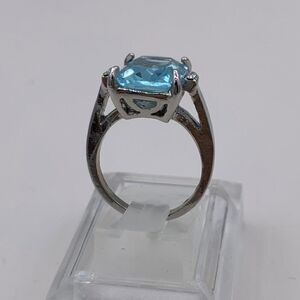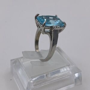 New item, no tags. When you don't want to invest the bank, this rhodium plated over metal ring of quality, featuring a large and lovely AAA blue topaz coloured CZ gem solitaire as the central piece has all the presence and flash of quality fine jewellery. Rhodium for tarnish free, durable, platinum jewellery look (fyi this piece was advertised, priced by the manufacturer and purchased by us as rhodium finish over 925 silver but we can find no stamp so we are pricing as "fashion jewellery" -our loss). Three round, brilliant cut clear CZ's on either side set of the lovely, impressive, sky blue CZ topaz, set in a raised and pierced gallery. Size 7, fashion jewellery. Sometimes you don't need to spend a fortune to get " The Look". You too can get Fresh with Lemon Squeezy Shop🍋