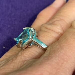New no tags. Large, clear, saturated, light blue coloured sapphire accented with round cut white diamonds in silver over stainless adjustable setting. Stones are man-made with excellent clarity and sparkle. Super affordable alternative to precious gems without sacrificing impact or appearance. Also available in yellow topaz in gold and purple amethyst in gold in Our Closet. Pretty for dress up, at home with casual jeans and tops. Pick up a few new complimenting pieces from Our Closet (some suggestions shown all listed and priced separately), make a bundle to save even more. New postings daily so there's always something fresh at Lemon Squeezy Shop.