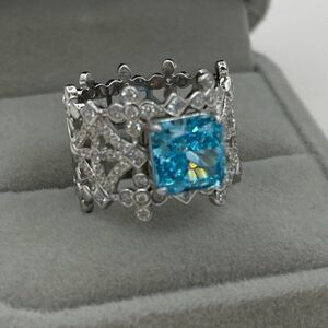New item with no tags. Size 7 solid sterling cigar band style setting, intricately fabricated into open filagree design with Old World flavour. Central stone is a lab created aquamarine with all the sparkle, attributes and depth of colour as mined stones, without the "Liz Taylor" price tag, 7.7 mm across with particularly good, saturated colour. Accent stones are high carbon lab white diamonds, setting off the large cental stone and running across the full face of the ring. Setting detailed fully all around. Beautiful colour, fine setting, high fashion styling. What more is there? This is how we get Fresh at Lemon Squeezy Shop🍋