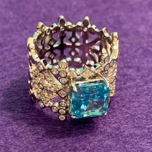 New item with no tags. Size 7 solid sterling cigar band style setting, intricately fabricated into open filagree design with Old World flavour. Central stone is a lab created aquamarine with all the sparkle, attributes and depth of colour as mined stones, without the "Liz Taylor" price tag, 7.7 mm across with particularly good, saturated colour. Accent stones are high carbon lab white diamonds, setting off the large cental stone and running across the full face of the ring. Setting detailed fully all around. Beautiful colour, fine setting, high fashion styling. What more is there? This is how we get Fresh at Lemon Squeezy Shop🍋