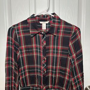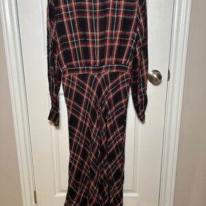 Brand new plaid dress, buttons up the whole front, not very stretchy material, long, sleeved, and floor length