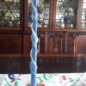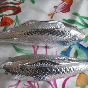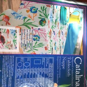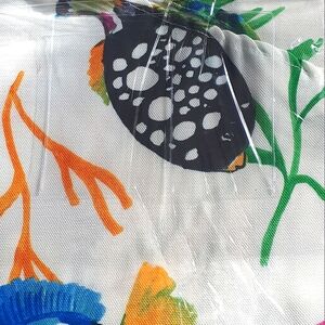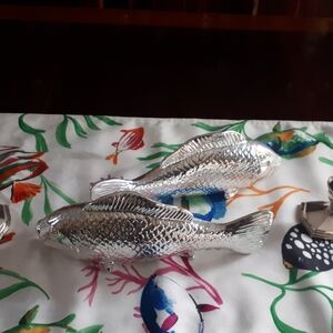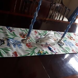 New whimsical round 100% treated polyester tablecloth in a vibrant fish pattern. 70 inches round. Easy care spillproof. Indoor/Outdoor. Nevee taken out of the package. Also for sale a large 104 inch rectangular tablecloth and runner of the same pattern. Practical but elegant. Fish salt and pepper shakers shown also for sale. See also the large shell candle, a perfect addition to the theme, also for sale. To finalize thw theme silver fish, a glass fish platter and the aqua blue twisted candles and silver candleholders are also for sale. A total theme.