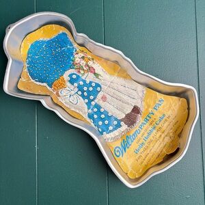 New vintage! Aluminum 1975 Holly Hobbie cake pan by American Greetings Corp. Model 502-194: produced by Wilton. This time traveling pan makes its way to you straight from your Gen X childhood. Never used, and still containing its original label. The label is rough but legible. The pan itself has some shelf wear from storage but is otherwise free of any damage.
