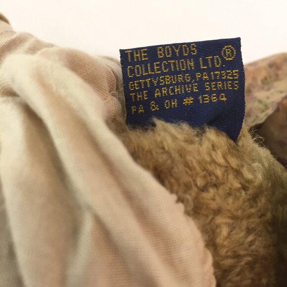 New with tags. Boyds Bears Lizzie McBee. She was made between 1990-1996. Now retired. She is 8 inches tall. Her dress has a ruffle collar, heart shaped buttons and straps at the back that you can tie in a bow. She has thin pants under her dress. The dress is removable. The matching bow on her head is fixed. Her paw pads are a darker brown velour type fabric. Her mouth and nose are embroidered black thread and her eyes are black. She is part of the Archival Collection and is an investment collectible. She is quite endearing.