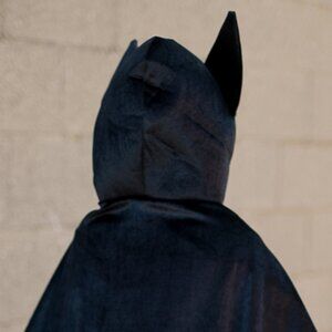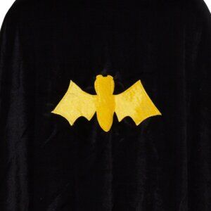 This hooded bat cape features large bat ears on the hood and an awesome bat emblem on the back of the cape. The cape is made from soft velour fabric and is cut like real bat wings with a scalloped edge.