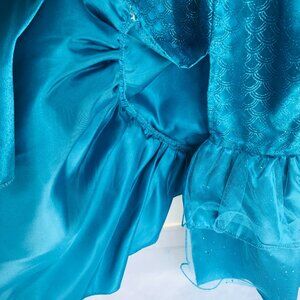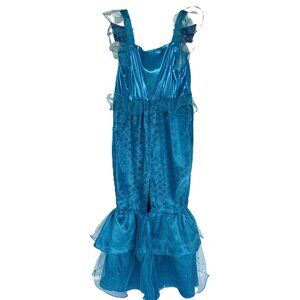 Be the princess of the sea in this fantastic floor length mermaid gown. Sparkly blue glitter printed scales run down the dress for a mermaid tale fit for an underwater princess. A pink satin inset gathers at the front and is trimmed in sparkle. Frilly organza accents will ensure all eyes on you when you walk in the room or swim with your sea side friends. Size: 5-6.