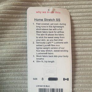 "Home Stretch SS 1. Feel covered yet cool, during long runs in this lightweight short-sleeve tee with a full mesh fabric back for airflow. The slim fit allows the fabric to wick the sweat away from your skin so you feel drier. 2. Seriously Light Luxtreme with added Lycra fibre is a lighter-weight version of our four-way stretch, sweat-wicking Luxtreme fabric. 3. Mesh fabric back lets your body breathe. 4. Slim fit, hip length."