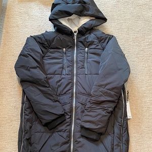 Size small but fits oversized. New with tags. Has liner end warm coat zipper sides can adjust for layering underneath