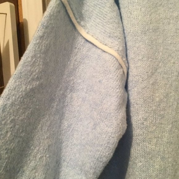 And in this soft blue color with contrasting white trim is is a beautiful sweater.