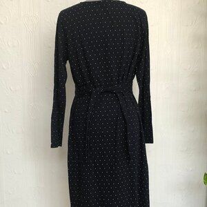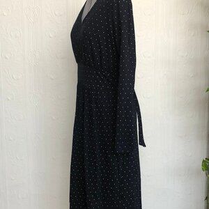 This dress has not been worn, but it is without tags. It is from the British clothing company People Tree, which make ethical clothing (fairtrade and ecological). It is navy, with white polka dots. The style is fitted close to the body, but still comfortable. Perfect for work or all kinds of occasions. The dress is made of a soft cotton jersey.